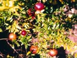 | Τα λουλούδια της είναι κόκκινα. Ο καρπός της, τα ρόδια είναι στο μέγεθος του πορτοκαλιού, με έναν σκληρό κιτρινοκαφέ φλοιό. Εσωτερικά, οι πολυάριθμοι σπόροι είναι κλεισμένοι ο καθένας σε έναν χυμώδη καρπό.( Έξοδος 28/33, Α΄ Βασιλ.7/20 ). | ![]() |
